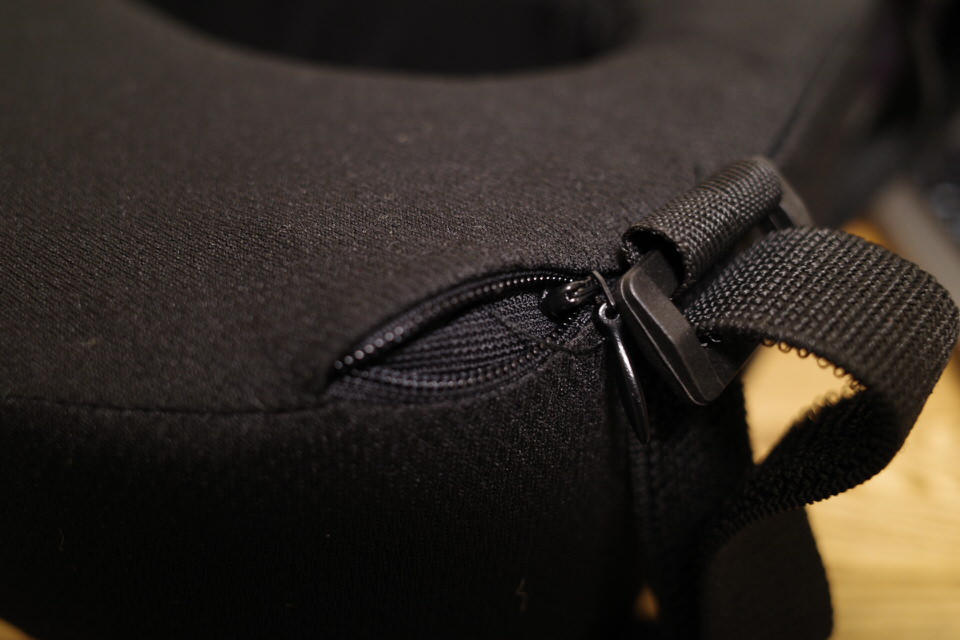ストラップが付属しているので、トラベルピローを首に巻いたらこれで調節するとフィット感が高まります。