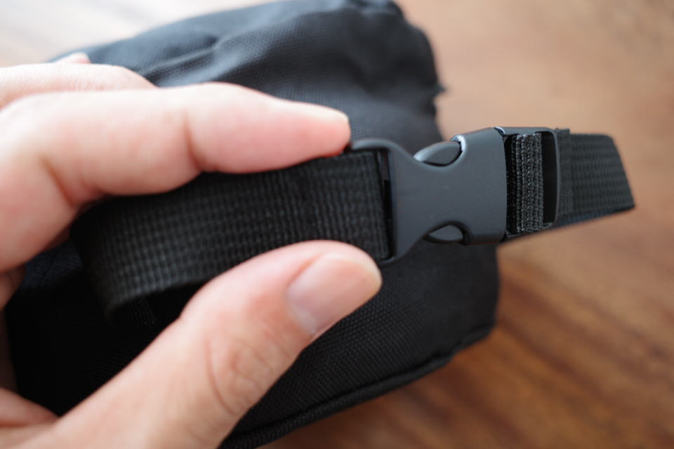 専用の袋のストラップには脱着可能装置がついているので、飛行機乗る前は機内へ持ち込むバックパックやスーツケースに引っ掛けておけば手が空きます。