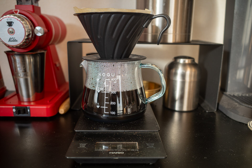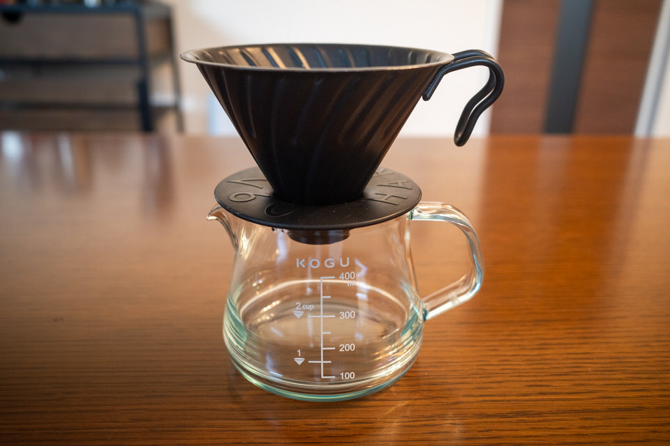 来客などを踏まえると大きいのもいいかもと思いましたが、結局サーバーだけ大きくてもドリッパーが小さければ複数回淹れることになるので、あれこれ状況を加味せずに普段使いにピッタリのサイズが一番いいと言う判断です。