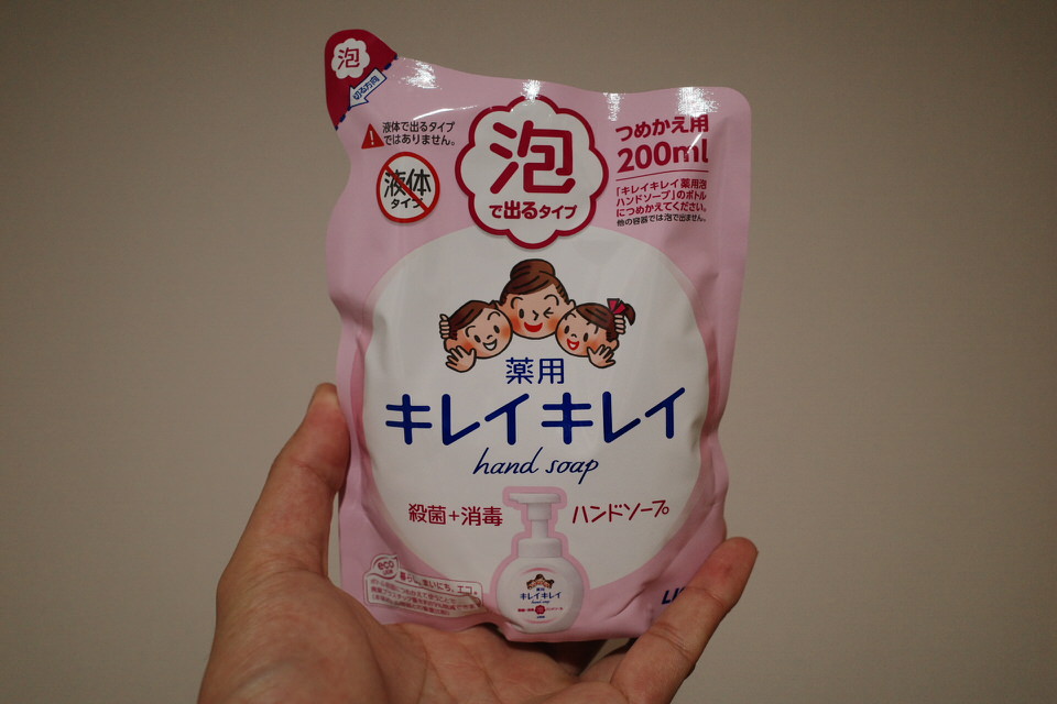 これまで我が家のキッチンでは、プッシュ式のキレイキレイを使っていたのですが「手洗い前の汚れた手でプッシュしたら容器がどんどん汚れていくのでは?」「その容器が常に置いてあるキッチン環境は果たして清潔なのか?」「濡れた手で触れると容器も濡れたり汚れていくの気になる…」とキレイキレイを見るたびにキタナイキタナイとモヤモヤしていました。