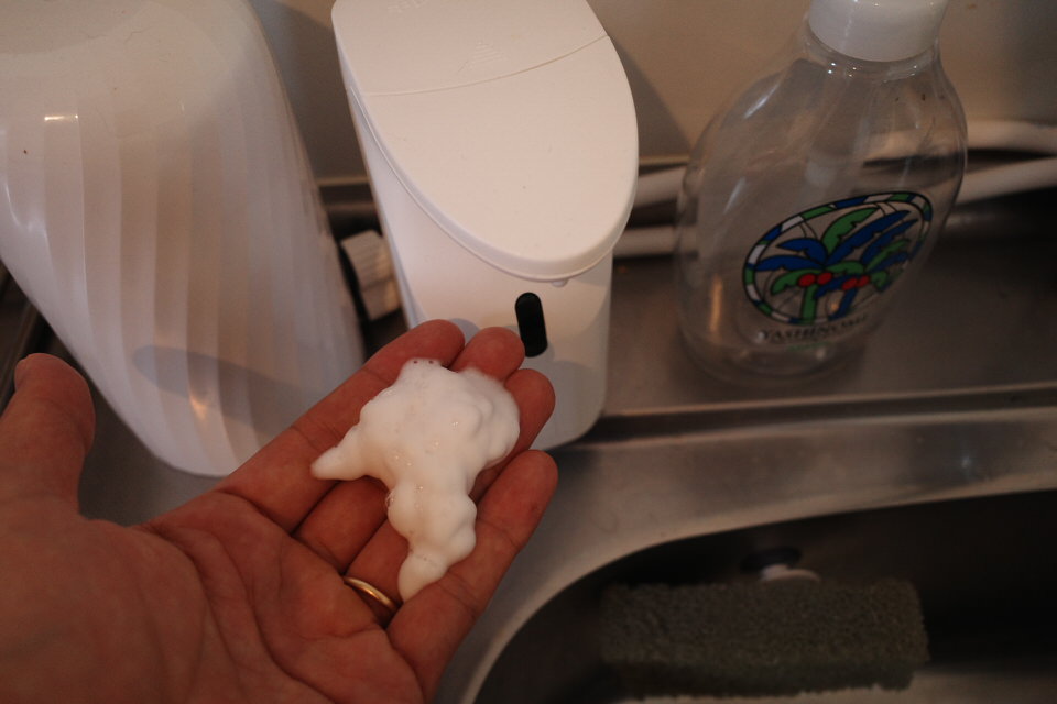 ということでこれを導入してから、汚れた手でハンドソープをプッシュすることなくなって嬉しい。キッチン周りをキレイにしたタイミングで、本体もさっと拭いておけばいつだって清潔。電源切り忘れたまま拭こうとしたり、本体の位置を動かそうとするとウィーンって不意打ちで泡が出てきて「あ、あ、あ…」ってなるのでそこだけ注意してご使用ください。