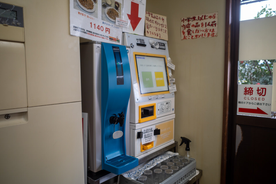支払いは現金のみで、清算すると自動で厨房へ飛ぶので、水をよそって席に座って待ちます。