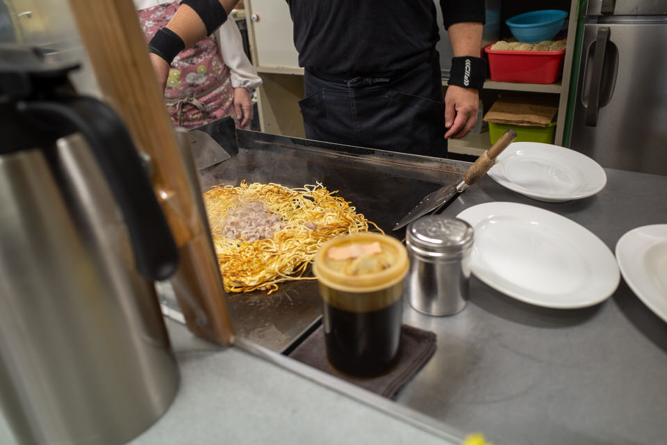 そばと肉をしっかり焼いた後にもやしが投入されることで、シャキッとした食感のもやしと一緒にいただけます。