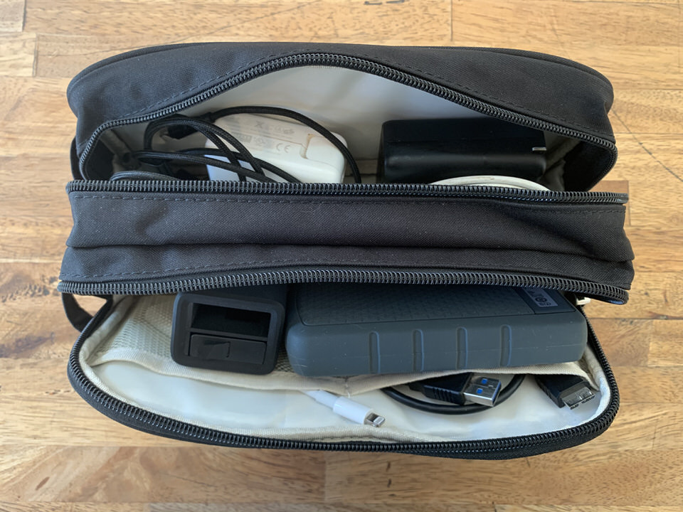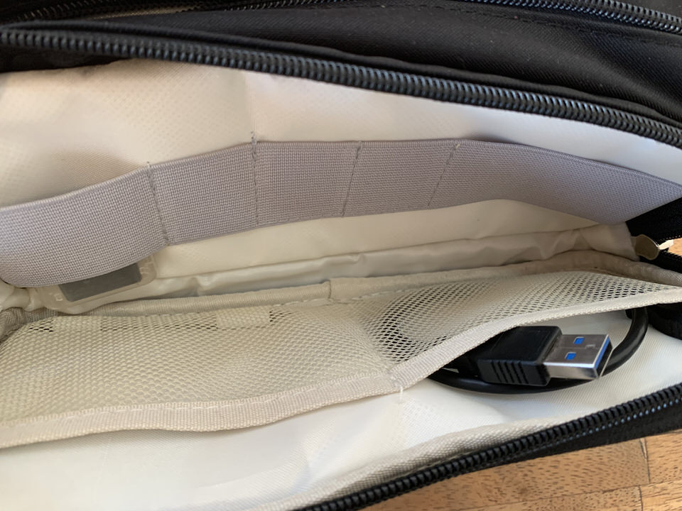 サイドに仕切る用のゴムバンドとかメッシュポケットがあるので、細々したものがどっか行かないのもいい。