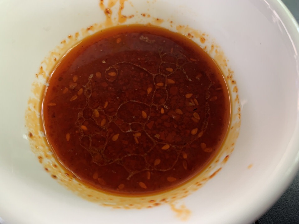 こちらはデフォルトで付いてくる餃子のタレ。辛さへの味覚がまぁまぁバグってるぼくは気にせず食べ続けましたが、辛いの好きだけど苦手な彼女が最初の一つに付けて食べた後に少しむせながら「も…もう使わない!み…みず…」って言ってました。辛いんだと思います。
