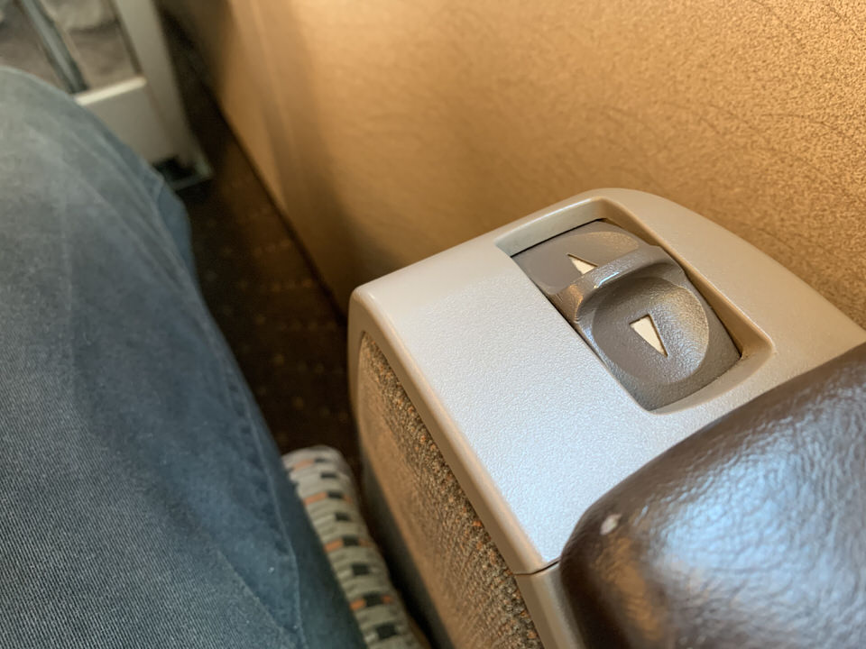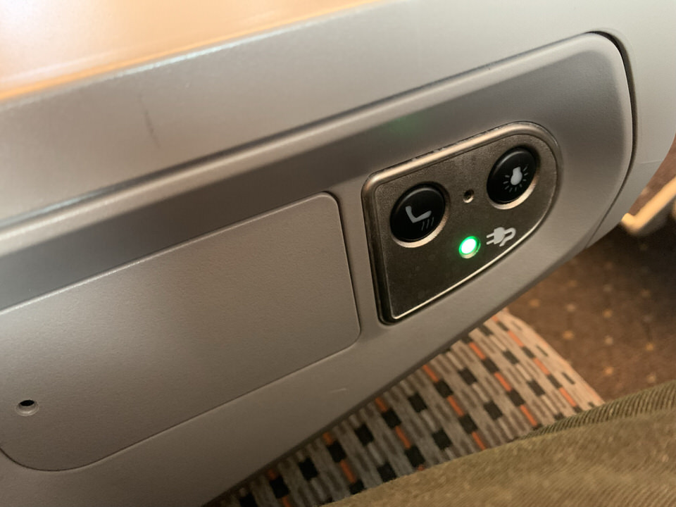 隣の人との間の肘掛には読書用ライトや座席下ヒーターのボタン、電源コンセントなどがあります。
