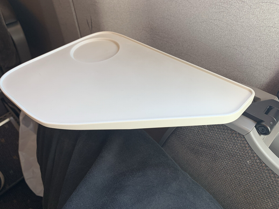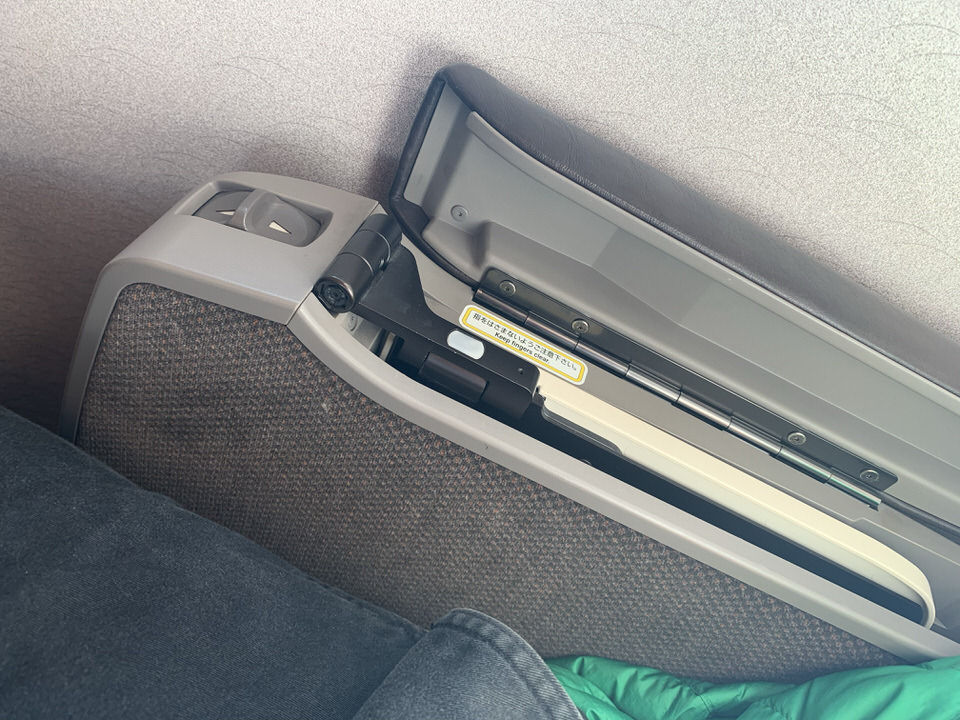 前の人のシート裏にも机がありますが、このようなミニデスクも引き出せるので飲み物やおつまみ置いたりするのにちょうどいい。
