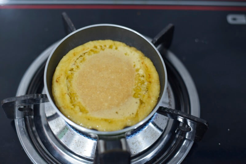 流し込んだら弱火にして焦げ付かないように注意しながら中心部がフツフツしてくるまで加熱。