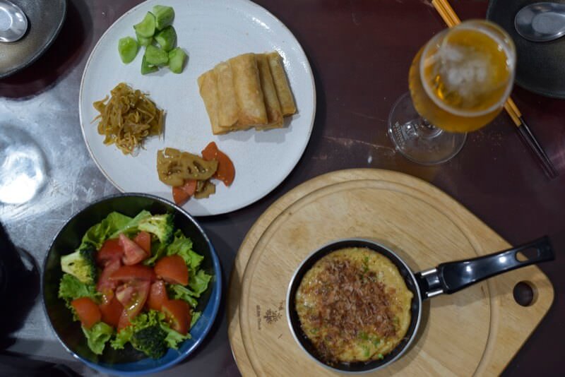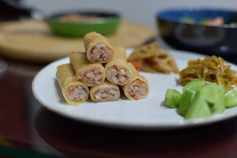 春巻きの後ろの山芋ステーキを乗せたフライパンが霞んで見える。脱帽。